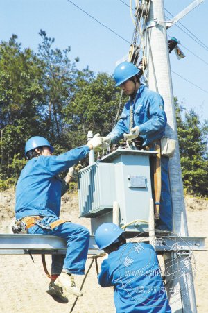 自2007年起,我市连续几年把新农村电气化建设与改造工程列为市重点工程,累计投入资金3.51亿元,开展新农村电气化建设及相配套的电网改造与建设, 已全面完成9个乡镇(街道)、145个村的新农村电气化建设任务。去年,我市成为浙江省新农村电气化建设示范县。图为电力工人正在改造农村线路。