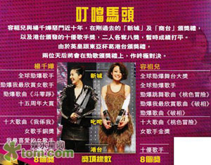 踏入新一年,新城电台与商业电台先后发出乐坛成绩表。女歌手方面,杨千嬅借婚宴冲旺人气,成功在两大颁奖礼上狂扫多个奖项,成绩不落后过去几年独领风骚的容祖儿,二人暂时同夺八奖,打成平手。