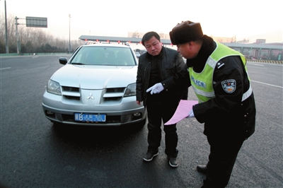 昨天8点30分,河北的田先生驾驶着河北牌照的桑塔纳车行驶到四方桥匝道处,被交警拦下。由于他没有进京证,又在7点至9点的限行时段在五环内行驶,当场被合并罚款处理200元,成为新措施实行后被处罚的第一人。