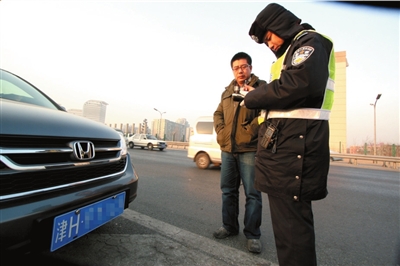 一辆天津牌照的车辆违反限行规定在四方桥被拦下接受处罚。