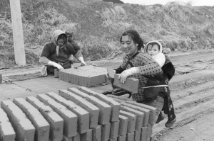 今天上午,室外寒风刺骨。嵊州市甘霖镇的一家砖瓦厂内,两名外来女工背着孩子正在搬运砖坯。她们说,趁着这些天工钱高,多挣点钱回家过年。这几天最低温度都在0℃以下,有关部门和企业也要及时提醒工人特别是室外工作人员做好保暖工作,对外来工的孩子也要多关照。(记者 张亮宗 摄)
