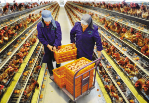 嵊州市经济开发区同盛昌禽业有限公司投资1000余万元建设的养鸡场内,2万多只蛋鸡每天源源不断地为市民供应新鲜的鸡蛋。据悉,这也是绍兴市首个按国家标准化要求建设的养鸡场。图为昨日该公司工作人员在进行捡蛋作业。