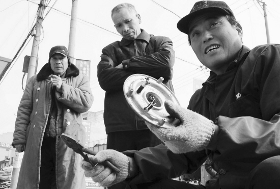 前天,嵊州市崇仁镇的一处旧电饭煲回收处,一位收购人员当场对收购的旧电饭煲“分档取料”。据该回收人员介绍,旧电饭煲最值钱的就属这“炉蕊”,是铝和铅的材质,外壳的价值不如这“炉蕊”。 (记者 张亮宗 摄)