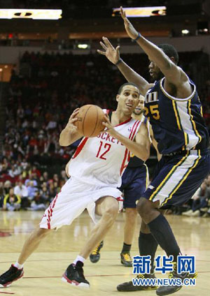 1月8日,火箭队球员马丁(左)带球突破。当日,在NBA常规赛中,休斯敦火箭队主场以99比103负于犹他爵士队。新华社发(宋穹摄)