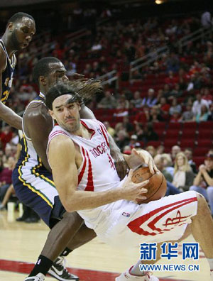 1月8日,火箭队球员斯科拉(右)突破时被对方球员拉倒。当日,在NBA常规赛中,休斯敦火箭队主场以99比103负于犹他爵士队。新华社发(宋穹摄)