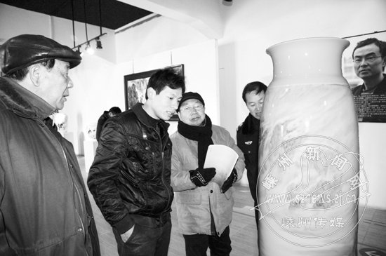 1月7日—9日,由市文化产业促进会主办的景德镇瓷器名家名作新春展在市艺术村举办,80多件名人名作瓷器吸引了我市不少艺术和收藏爱好者前去参观。图为市民在欣赏瓷器精品。