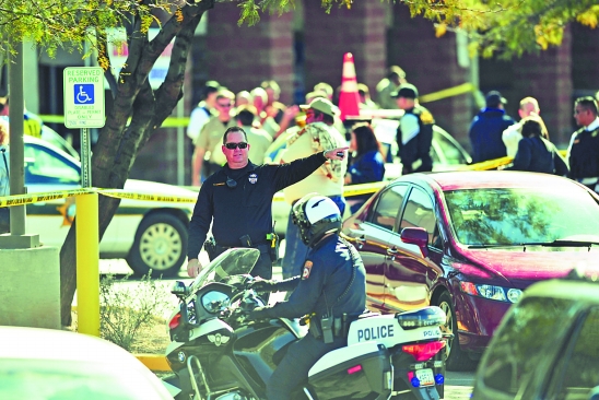 警察聚集在美国亚利桑那州图森市的枪击案现场。新华社发