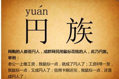 “円”到底是个嘛东西,它又怎么能这么给力的表达出一票网购族的心思呢?其实“円”的本意是“货币”钱的意思,是日文中圆形的简体字,也是日元的缩写。“円”和“囧”,能成为一种流行的表情符号,靠的就是自己的长相——“看起来像个鼠标,够宅够给力”。微博草根明星生活小智慧为円族解释道:“基于淘宝官方盛典数据的发布,导致网民们看到数据后群情激动,几千亿的数据都是网购贡献,网民贡献的不是物品,不是精神,是円。同时,円的形状类似鼠标,而且円的本意是“货币”钱的意思,为此円是成群网民用鼠标花钱的人,此乃円族”。