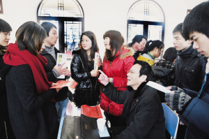 在1月8日举行的嵊州越剧艺术学校2011届毕业生实习就业洽谈会上,50多名毕业生被来自全国各地的26家越剧院团、企业等用人单位一“抢”而空。据了解,这种现象的出现在该校已经有10余年了。这次前来参加毕业生实习就业洽谈会的,既有上海越剧院、乐清市越剧团等国有专业越剧团,也有从宁波、台州、海宁等地闻讯赶来的民营剧团。在这次招聘会上,嵊州当地的百丈飞瀑风景区也加入到了招聘单位的行列。“我们想招两个会唱越剧的小姑娘当导游,为游客唱唱越剧,在山水旅游中融入越剧文化氛围。”百丈飞瀑管委会主任说。