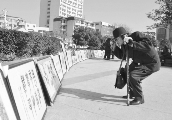 日前,嵊州市老年书画协会组织会员在该市城市广场举行迎春书画展,100多件书画作品引得过往市民驻足观看。图为展出现场。 (记者 张亮宗 摄)