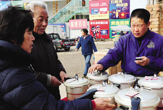 1月7日,嵊州市崇仁镇的集市上,一些市民正在一处高压锅以旧换新的临时摊点进行调换。专家提醒,高压锅并不是普通锅,需要有品质的保障,打一枪换个地方的临时摊点,市民还是不换为妙。(记者 张亮宗 摄)