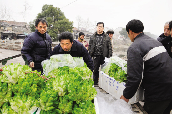 1月6日,嵊州市甘霖镇白泥墩村的蔬菜基地生产的“娃娃菜”,正被发运至义乌的蔬菜市场。今年嵊州种植的“娃娃菜”在义乌蔬菜市场呈现供不应求的态势。 (记者 张亮宗 摄)
