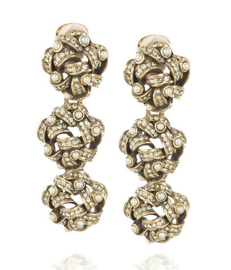 这对用树脂、珍珠和水晶打造的Oscar de la Renta三段装饰结耳环有着优雅的扭曲造型,一环扣一环,华丽而复古,适合正式的场合,夹式的设计即使没有耳洞也可以佩带。