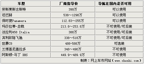 9款顶级豪华座驾当中,只有劳斯莱斯、迈巴赫和保时捷三个品牌车型的原厂导航系统,可以在国内正常工作。玛莎拉蒂、法拉利、宾利以及世爵四个品牌,虽然有这项配置,但是不能直接使用,需要后期对系统进行改造或更新后才能使用。而大牛兰博基尼和阿斯顿马丁这两个超跑品牌,虽然国外版本有,但是国内购买这两个品牌的朋友,就可以正式向导航系统讲拜拜了。