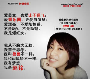 昨日被曝光的凡客图中赵铭的配图是一张酷似徐濠萦的素颜照,配有文字说明:“爱姜文,也爱让子弹飞;爱娱乐圈,更爱当演员;爱漂亮,不爱炫性感;不是G奶,不是助理,我是爆红女。”赵铭先前在采访中透露,已有导演相中她并开始洽谈剧本,她也邀请了业内资深人士担任经纪人,开始以健康形象步入演艺圈。
