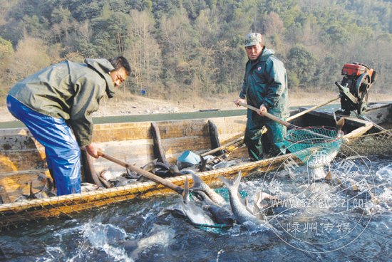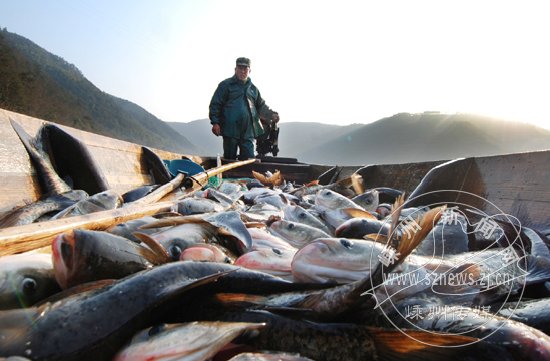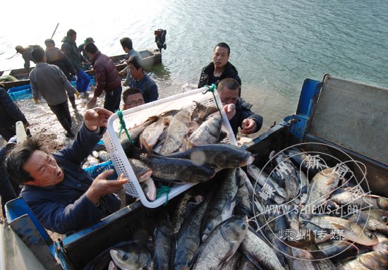 1月12日下午,记者在南山水库看到,一只装满鱼的渔船已经靠岸,周边围满了买鱼的人。记者坐着船来到水库拉网处,看见渔民一拉起网,大量活蹦乱跳的鱼儿都被收进网中。这里的鱼以胖头鱼为主,胖头鱼一出水便大口大口地喘着粗气。由于南山水库是不允许投放饲料的,因此这里的鱼是纯天然生长的。捕捞上来的鱼通常在5斤左右,生长期大概两年左右,肉质特别鲜美。因此每年冬季,南山水库拉网捕鱼,就会吸引大量的本地和外地客商前来买鱼。据估计,今年这季鱼有5万斤左右,大约要捕捞5天。