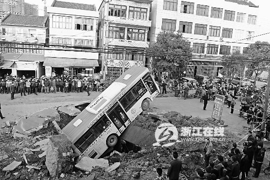 道路下面爆炸,公交车掉入深坑。 |