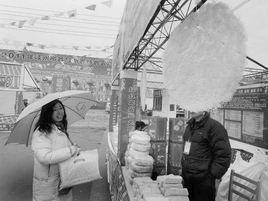 近日,嵊州农产品展会开锣,共设置展位100多个。香肠、腊肉和炒货摊上的商品最为抢手,许多市民忙购买。展会上,巨型榨面悬空挂起,吸引了人们的目光。 (记者 张亮宗 摄)
