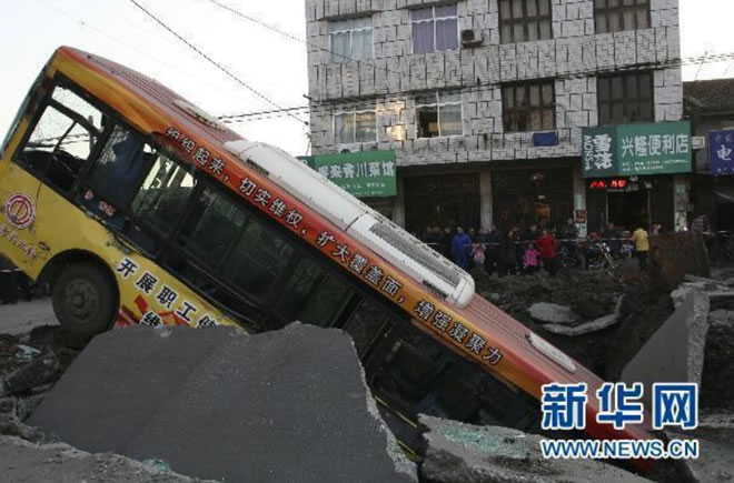 1月16日,瑞安一道路发生爆炸,公交车掉入路面大坑中。 新华社发(蔡宽元 摄)
