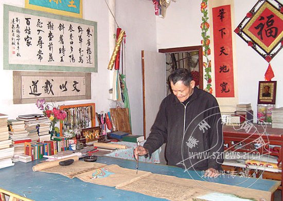 日前,笔者来到三界镇任枫村吴德法家,这位朴素的农民正在自己取名的“三余室”里聚精会神地创作关云长的大幅画像。