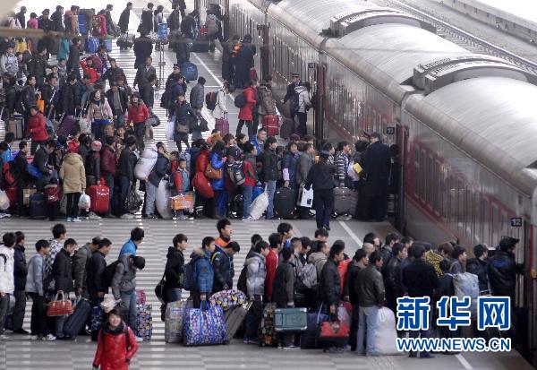 当日,铁道部召开全国铁路春运新闻发布会,向公众介绍今年铁路春运的总体态势和铁路部门的准备情况。今年铁路春运自1月19日起至2月27日,为期40天,预计全国铁路发送旅客2.3亿人次,同比增长12.5%。新华社发
