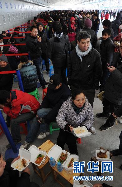 1月16日,几位排队购票的旅客坐在车站提供的小板凳上吃饭。