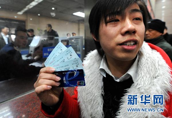 1月17日,一位旅客在南京火车站售票窗口前展示他刷卡购买的车票。