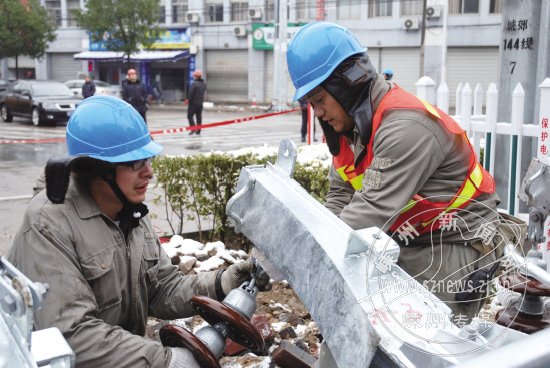 为解决城南变负荷不足,确保居民、企业用电迎峰度冬,1月19日上午,市供电局对15000kw负荷进行转移,由原35kv城南变转移到110kv中宅变。据介绍,这次转移将缓解城西、水厂、宅南、宅高、宅环等五条线路的用电压力。图为工人在风雪中施工。