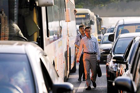 上班族只能在马路中间下车步行 阙道华 摄(资料图)