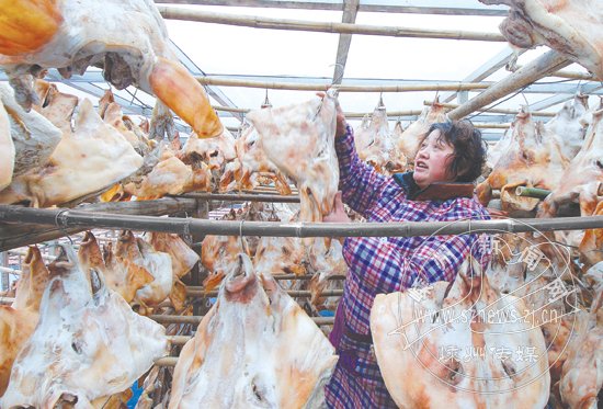 连日来的雨雪天气过后,迎来温暖阳光,人们利用这难得的晴好天气忙着晾晒年货,新春佳节的年味越来越浓。图为黄泽镇上的一位农妇正忙着晾晒腊猪头。