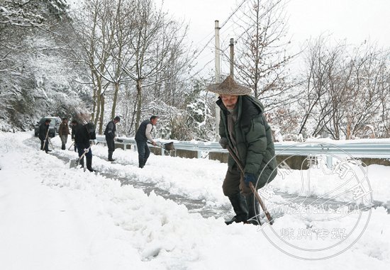 日前,我市一些山区大雪纷飞,一些地方的积雪厚达二三十厘米,群众出行困难。很多村民自发在主要道路上清除积雪,疏通要道。图为仙岩至天竺沿线村民正在清理道路积雪。