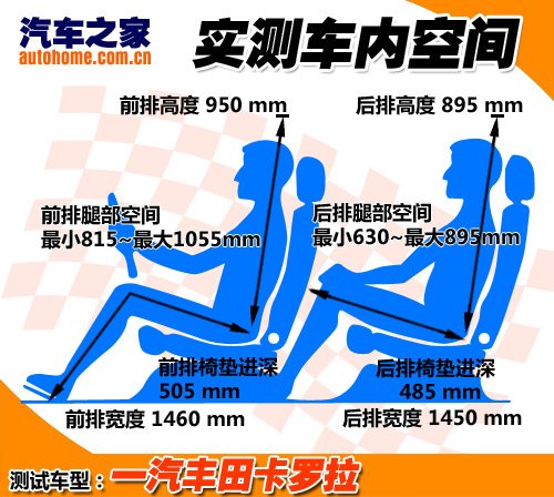 在家用车市场叱咤多年,在内部空间上应该有着不俗的表现,让我们来看看在空间上,卡罗拉是否能经得起后起之秀的进攻。它的轴距为2600mm,正好符合我们第二组的轴距长度,经过测量的成绩为:车内乘坐空间为1710mm,后排高度为895mm,后排宽度为1450mm,后排座椅进深为485mm。