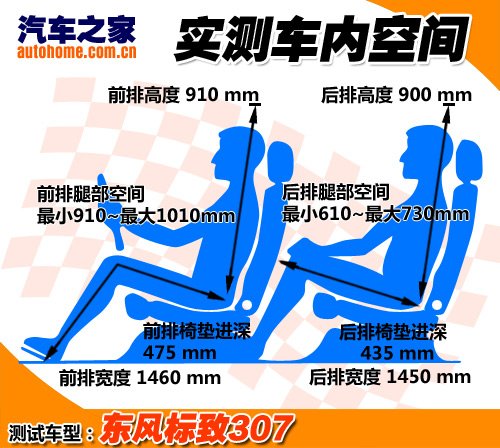 307的轴距为2612mm,与宝来之间相差毫厘,如此接近的轴距长度,它们在空间上的表现又如何呢?标致307我们最后测得的数据为:车内乘坐空间1640mm,后排高度为900mm,后排宽度为1450mm,后排坐垫进深为435mm。