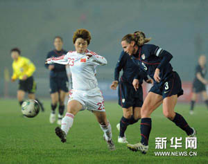 1月25日,中国队球员尤佳(左)与美国队球员丹普争抢。当日,在重庆永川举行的四国女足邀请赛最后一轮比赛中,中国队以0比2不敌美国队。新华社记者周衡义摄