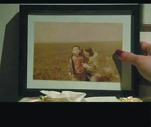 根据剧情,主人公罗开平带着女朋友回家。女朋友进入罗家的一个房间,镜头扫过桌上的两张照片:一张是个小男孩的单身照,另一张是小男孩和一个女人的合影。