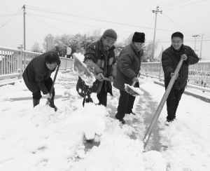 嵊州市鹿山街道小砩大桥架在澄潭江两岸,系交通要道,可方便小砩、中央宅等10余个行政村1万多群众出行。2007年10月,受台风“罗莎”影响,老桥被洪水冲毁,造成交通中断。为满足附近群众通行需要,2009年12月,小砩大桥水毁改造工程正式实施,新建小砩大桥长140米,宽8米,总投资450余万元,今年1月21日正式通车。图为通车前村民自发到桥上扫雪。【来源:绍兴日报】