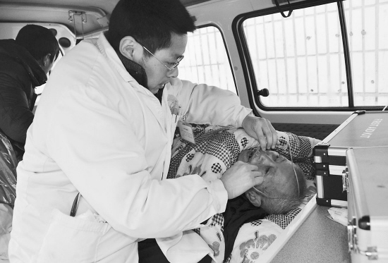 21日早晨,嵊州市人民医院急救中心的一辆120急救车匆匆穿行在冰雪路面上,将里南乡的一位老年病人接到该院救治。 【来源:天天商报】