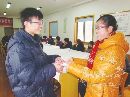 为了鼓励和扶持残疾青少年获得更高学历,我市自2005年以来,已向105位残疾大中专生和来自双残家庭的大中专生发放助学金25万元。图为工作人员向他们发放助学金。