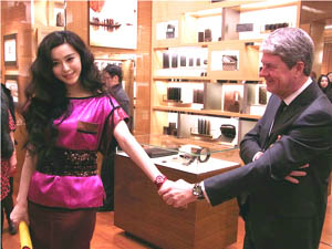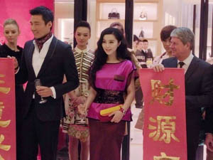 当天范冰冰一袭最新季颇具中国风特色的紫红色改良旗袍式裙装甜美亮相,并由该品牌全球总裁亲自全程陪伴参观新店,介绍新品,受重视程度可见一斑。而该品牌专门为2011情人节推出的女款腕表同期亮相,范冰冰迫不及待试戴,更受总裁先生之邀一起大秀情侣表款,亲密非常。