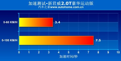 君威的2.0T涡轮增压发动机其实是萨博LK9经两次改进发展而来。带有双流道设计、直喷以及DVVT使得输出功率达162kw,350N·m的惊人扭矩可在2000转爆发并保持到4000转。高出9kw的功率把奥迪的高功率版2.0TFSI甩在其后,而扭矩与A4L 2.0T S-Line、力狮2.5GT持平。与其搭配的变速箱为6速手自一体。在百公里提速的实际测试中强大的扭矩令245轮胎毫无招架之力,前轮空转瞬间失去抓地力,但此后又能很快进入状态。前半段加速迅猛,后半段有些减弱,使得百公里加速耗时7.5秒,在同等价位车型中也只有使用了DSG的迈腾2.0T能与其匹敌。