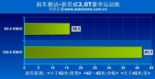 2.0T君威制动距离仅为41.7米,反而落后于只有225轮胎的2.0低配版。后轮通风盘只对连续制动后的热衰减有效,对制动距离却没有积极的影响。