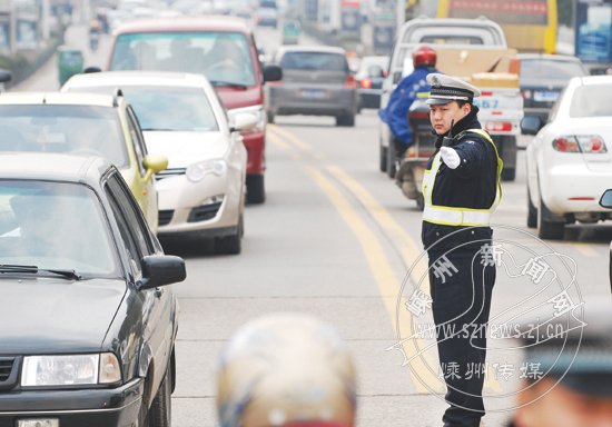 随着春节临近,市民出行增加,道路拥堵现象较普遍。我市交警部门多措并举,全警上路,加大执勤力度,力促节前道路顺畅。图为交警正在市区东桥一带维持交通秩序。