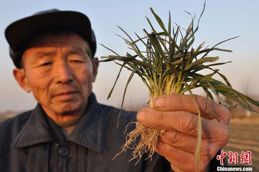1月24日,山东邹平县好生镇蒙二村村民在查看干旱的麦苗。 董乃德 摄