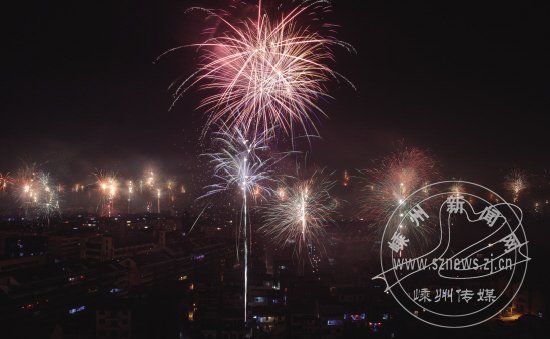 节日的夜晚,经常有美丽的焰火绽放在剡城上空 ,一派喜庆的景象。