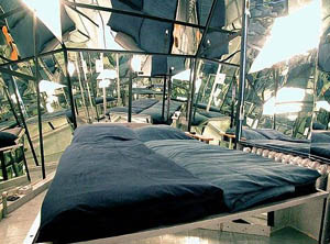 在旅馆最顶楼,除了可眺望柏林夜景,门窗紧闭后就全是镜子组成,墙壁全是钻石型状的镜子,躺在床上向四周望,可以看到不同角度的自己,十分有趣。