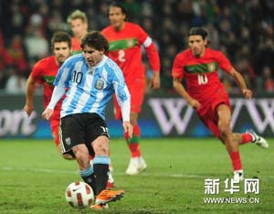 2月9日,阿根廷队球员梅西(前)在比赛中带球突破。当日,在瑞士日内瓦举行的一场国际足球友谊赛中,阿根廷队以2比1战胜葡萄牙队。新华社/美洲通讯社