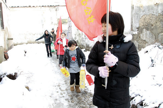徐弈煊是跟父母一起来的,父亲徐洲给5户贫困户买了炖鸭、小红毛花生及榨面等年货。在送年货的当儿,小小的徐弈煊表现很积极,抢着把花生送到贫困户手中,抢着把炖鸭递给贫困户。徐弈煊是越剧表演艺术家周宝奎的玄孙女,一段“心肝肉来啊呀宝贝肉”唱得很地道。这次参加我们的爱心活动,小女孩还带着这段经典唱腔和几只歌舞来呢。