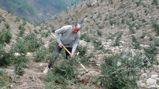 有一首赞叹老黄牛精神的诗:“老牛自知夕阳短,不用扬鞭自奋蹄”,这诗用在三界镇祝岙村68岁的省级绿化先进胡凤祥身上,是最妥当不过了。春节刚过,广大市民还沉浸在节日的氛围中,胡老伯整理好行囊又来到了海拔600多米的牛场山上,他已与这座昔日荒山厮守了23年。如今,他已不再满足于将1500多亩荒山种上普通的松树、杉树,而是要把这个山坡开发成高效的经济林。3年来,他栽种的450亩香榧已在成林,将昔日的荒山坡开发成千亩香榧基地已成了他的新愿景。图为胡凤祥正在培育管理香榧幼林。