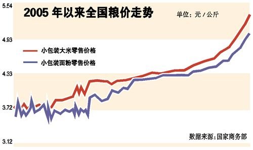 自去年下半年以来,国内粮价呈加速上涨态势。根据商务部公布的市场检测数据,截至2月4日,全国小包装大米零售价格为5.34元/公斤,与去年8月6日的4.83元/公斤相比,半年时间里上涨了10.56%。与过去多年数据相比,明显呈现加速上涨的趋势。在2005年初,该数据报3.67元/公斤,此后一直保持缓慢上涨的态势,至今,在6年时间里,整体涨幅只有45%左右。