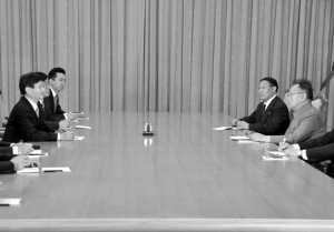 2月14日,朝鲜最高领导人金正日(右一)在平壤会见中国国务委员、公安部部长孟建柱(左一)。 新华社发